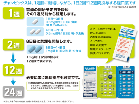 禁煙治療は、初回診察に加えて、初回診察から2週間後、4週間後、8週間後、12週間後の計4回の再診で構成されており、その間に以下のスケジュールで薬を服用します。